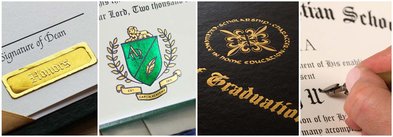 We believe in the value of home education, and in the importance of celebrating with dignity. That’s why we strive to make every diploma a work of art. We offer several handcrafted upgrades to further enhance your diploma such as hand calligraphy for the student name, 23kt gilding, and foil stamping done with letterpress type.